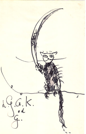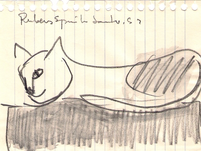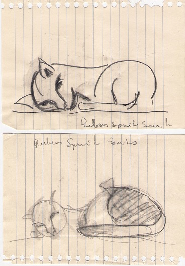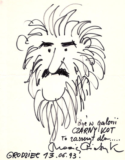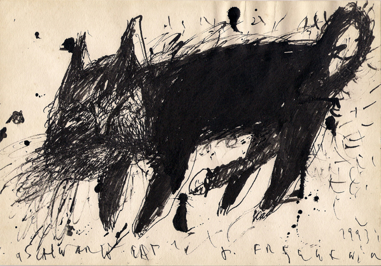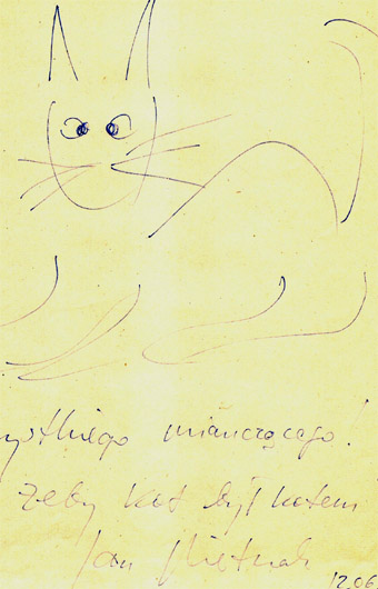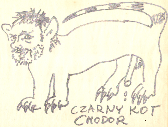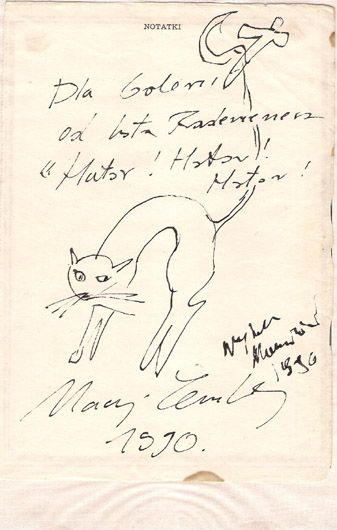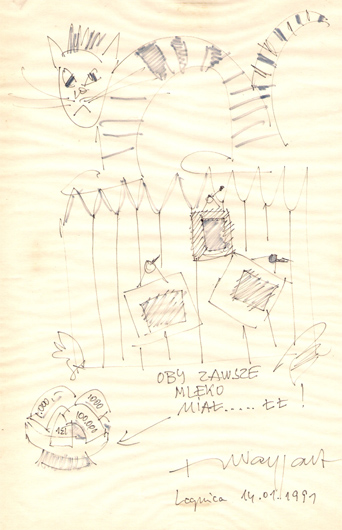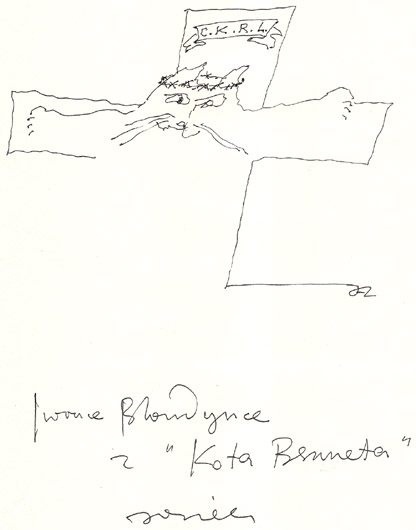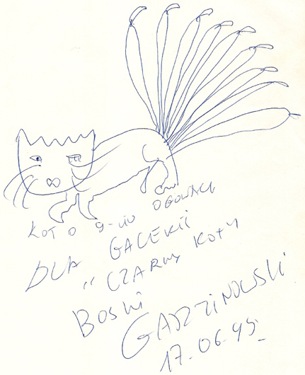 Długo rysuję koty. Ale im dłużej je rysuję, tym mniej o nich wiem. Z jednej strony żywa energia. Z drugiej, spokój i powaga godna lepszej sprawy. Z jednej ciekawość, popędzana z uporem niepojętą wręcz aktywnością a z drugiej, wzór rozpasanego lenistwa sennie upływającego niezależnie od pory dnia i nocy. Już Leonardo w rysunkach kotów z lat siedemdziesiątych i początku osiemdziesiątych XV w. usiłował uchwycić ruch, przedstawiając dziecko bawiące się z kotem. Z prawdziwą czułością też pokazywał dziecko ściskające i głaszczące kota, który próbuje uciec. Fakt, że kot się wyrywa nie odbiera rysunkowi piękna. Podobne napięcie odnajdziemy w szkicach do przedstawienia Madonny z dzieciątkiem i kotem. Ten pełen wdzięku realizm potwierdza tylko, że kot jest piękny zawsze i że wcale nie jest go łatwo narysować, choćby się to robiło całe życie - tak jak Leonardo da Vinci. Kotom poświęcony jest także zbiór wierszy "Skąd się w kocie bierze mruczenie?" powstały pierwotnie jako swoisty notatnik rysunkowo-poetycki (tzw. "czarny zeszyt"). Wierszyki są zapisem moich spostrzeżeń, czasem z przymrużeniem oka, czasem bardzo serio. Historie kocich bohaterów to najczęściej historie moich własnych kotów lub kotów